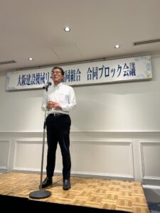 令和7年9月22日(月)19時から道頓堀ホテルにて、廣津副理事長の司会進行で組合員28社33名が出席した合同ブロック会議を開催した。